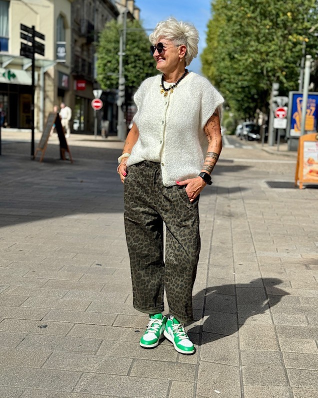 Une veste coup de cœur autant par sa coupe que son imprimé léopard foncé et tendance.