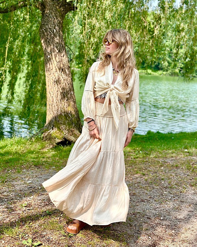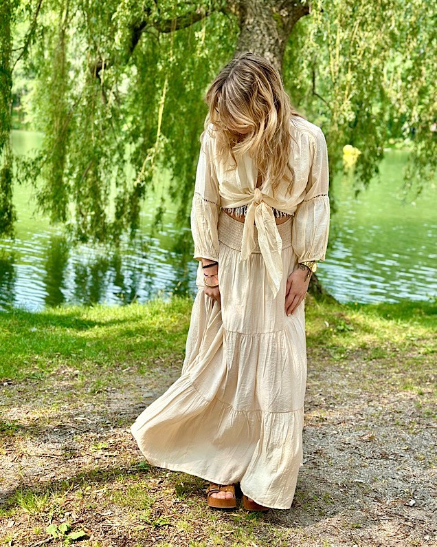 Gilet court à nouer avec des manches bouffantes 3/4, détails ajourés pour une touche bohème. Idéal à porter sur une robe ou bien seul comme une blouse.