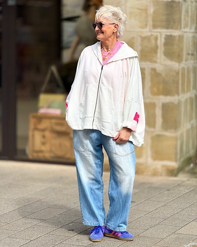 La mannequin mesure 1m70 et taille 38, elle porte la taille L pour un effet loose