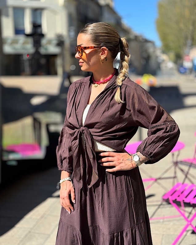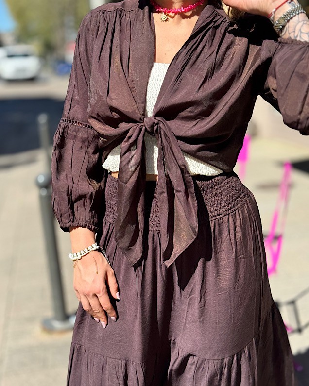 Gilet court à nouer avec des manches bouffantes 3/4, détails ajourés pour une touche bohème. Idéal à porter sur une robe ou bien seul comme une blouse.