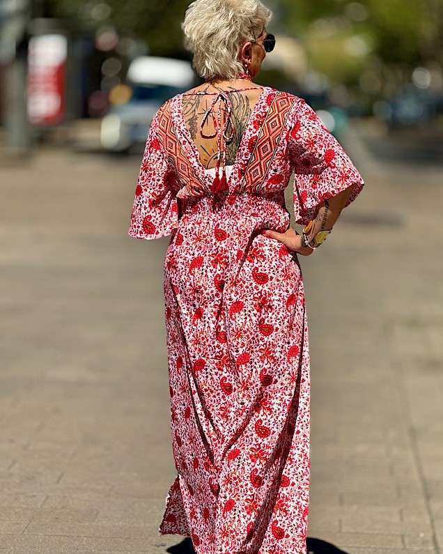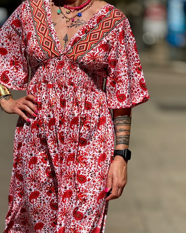Robe longue, dos nu et une taille smockée avec un élastique que vous pouvez régler au niveau de la poitrine. Elle possède 2 pans de tissu qui se nouent derrière la nuque afin d’ajuster le joli décolleté. Tissu soyeux très agréable à porter. Coup de cœur pour cet imprimé lumineux.